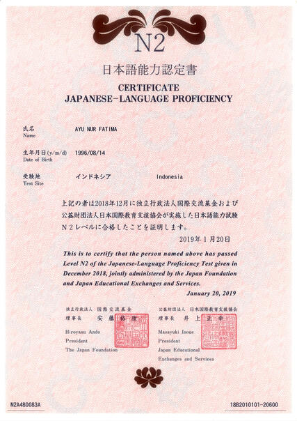JLPT (日本語能力試験) N2 Level (I've attached the certificate for the proof).